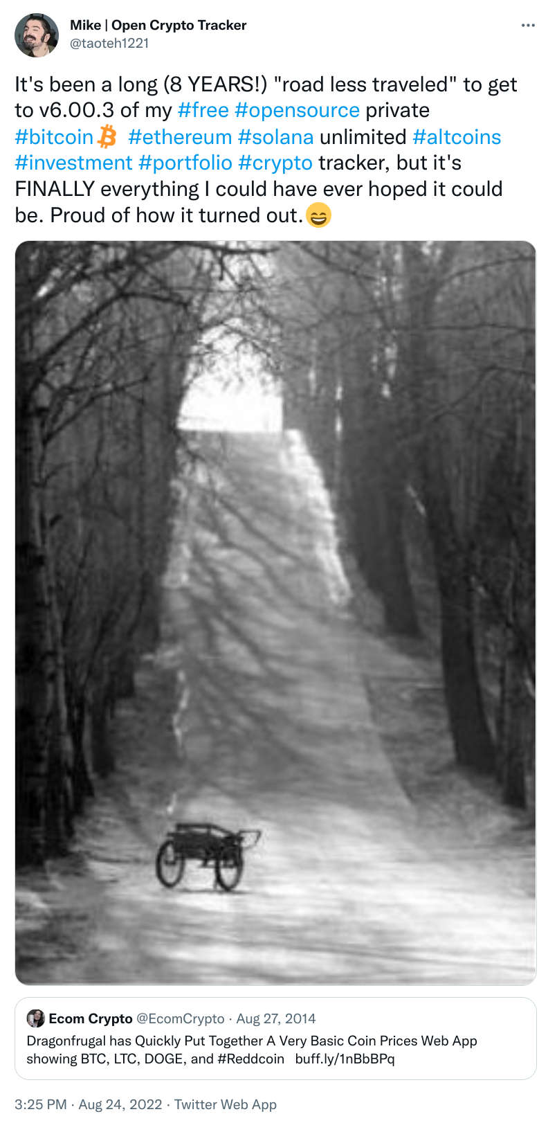 The primary goal of the Open Crypto Tracker project is to provide a 100% FREE / PRIVATE / Open Source cryptocurrency tracker to the crypto community, that 'just works', is easy to use, AND maintains a high level of user privacy / security. Previously known as 'DFD Cryptocoin Values', Open Crypto Tracker has been in active development since August of 2014. The source code was released on github.com later in September of 2015, under the "Open Source" GPL (version 3) license.